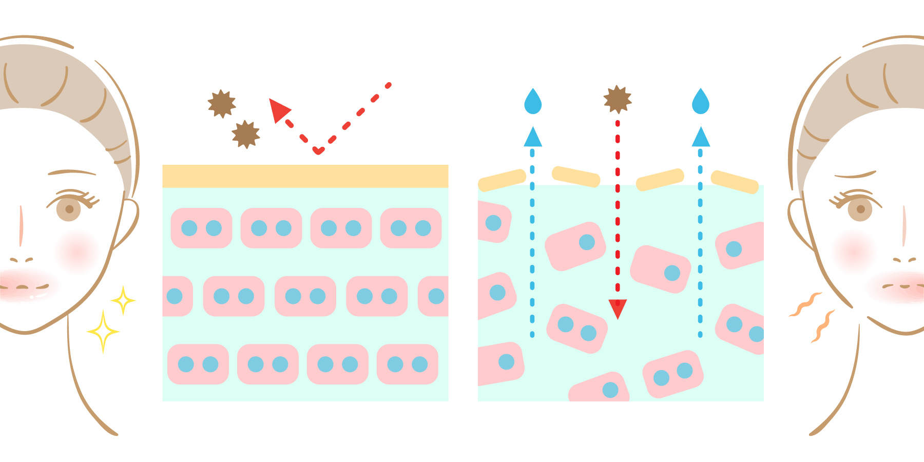 私たちの肌表面では、肌を守るためのバリア機能が正常に働いていることにより、肌内部に水や異物が侵入するのを防いでいます。