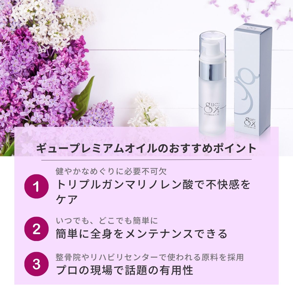ギュープレミアムオイルは、スムーズな日常や肌の弾力性をサポートする、身体に必要不可欠な必須脂肪酸「ガンマリノレン酸」を含む美容マッサージオイルです。