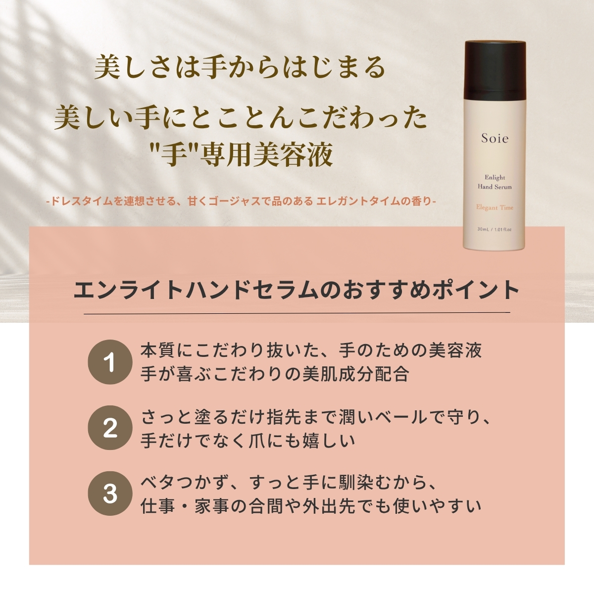 エンライトハンドセラムは、SOIE(ソワ)独自の手の研究から開発された "オールインワン ハンド美容液"です。