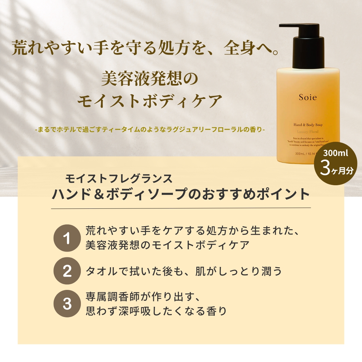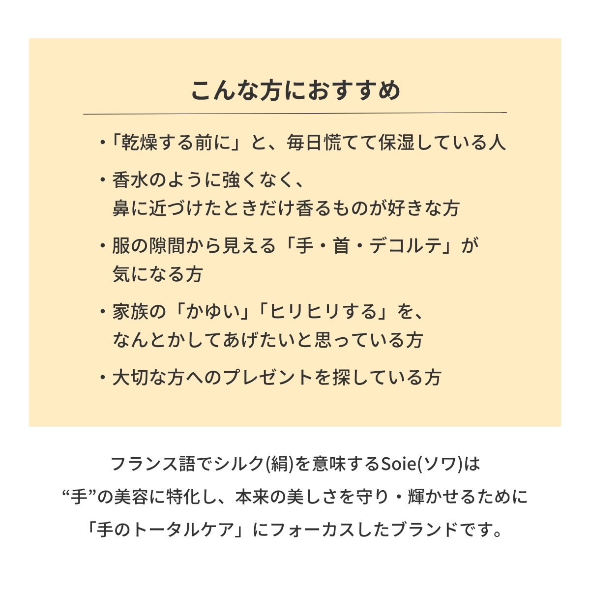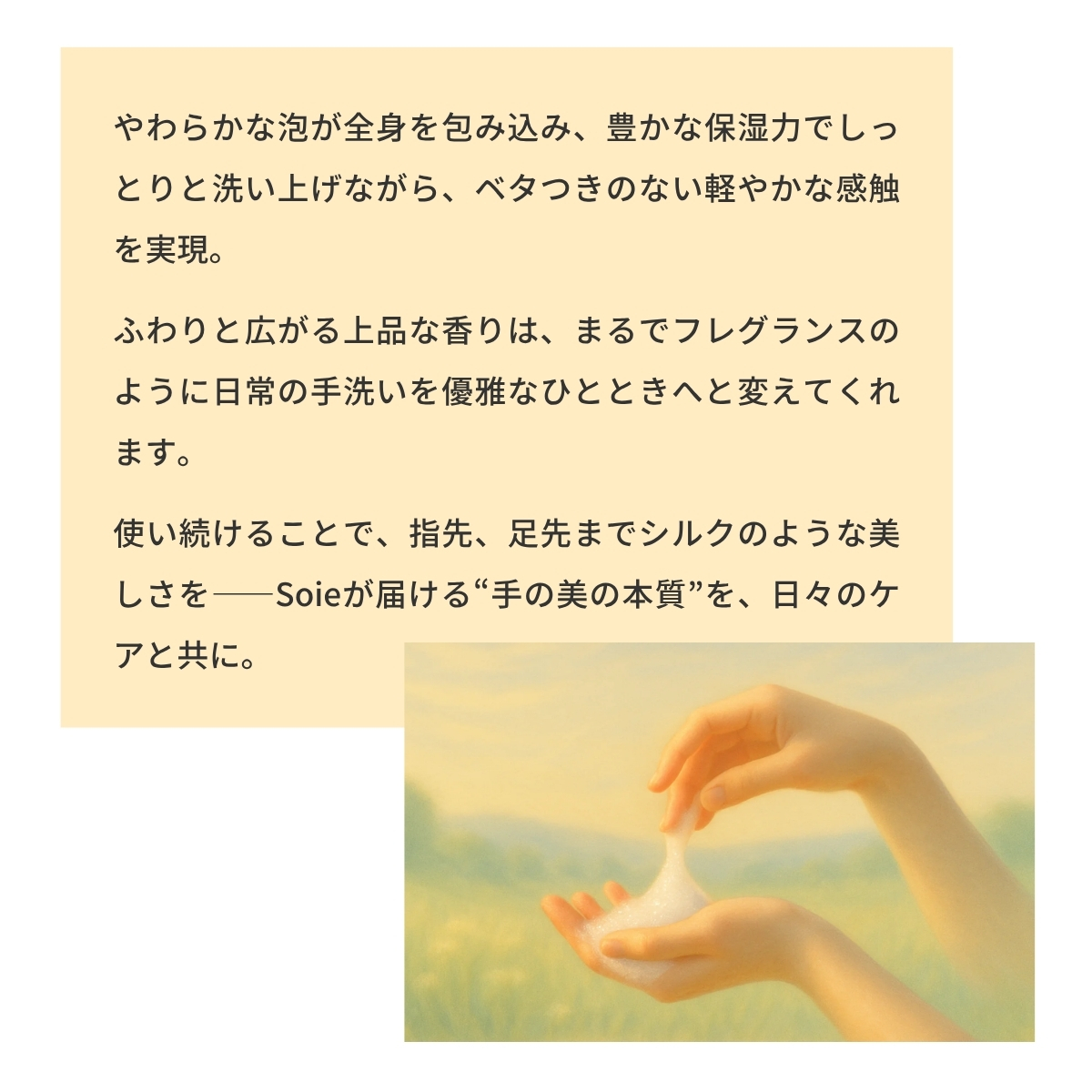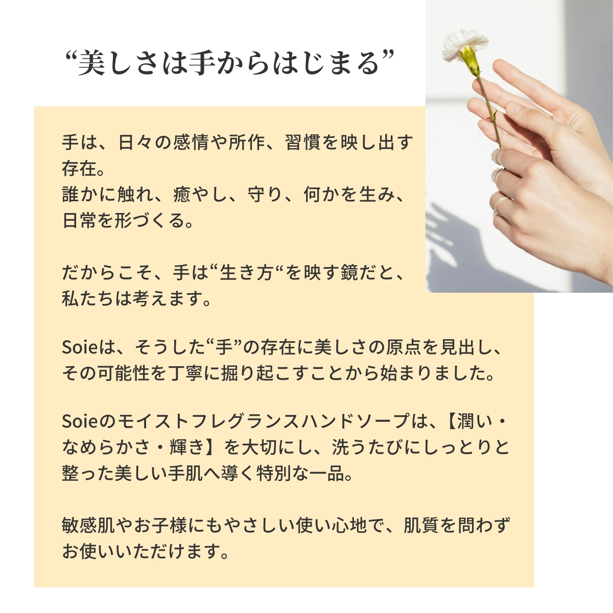 アルコールフリー・石油系成分不使用のやさしい処方で、敏感肌の方もお使いいただけます。ソワ専属調香師による奥行きのあるフレグランスが、日常の手洗いやバスタイムを特別なひとときへと変えてくれます。