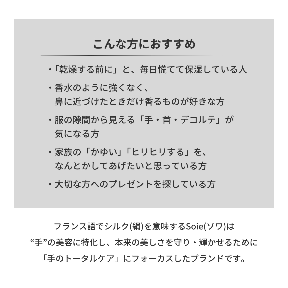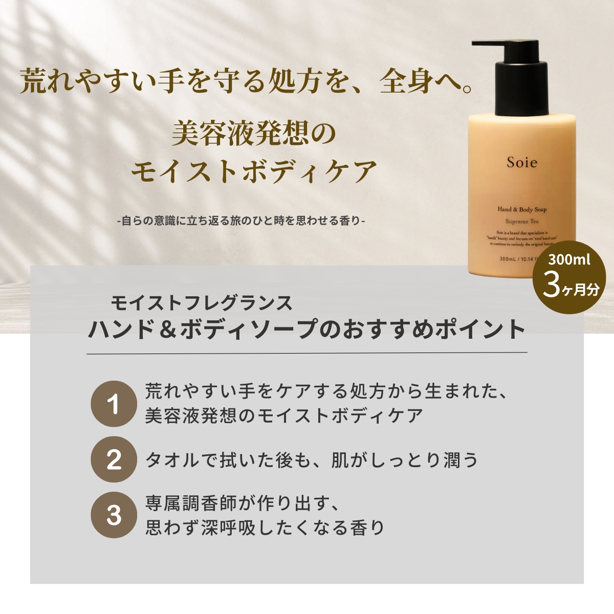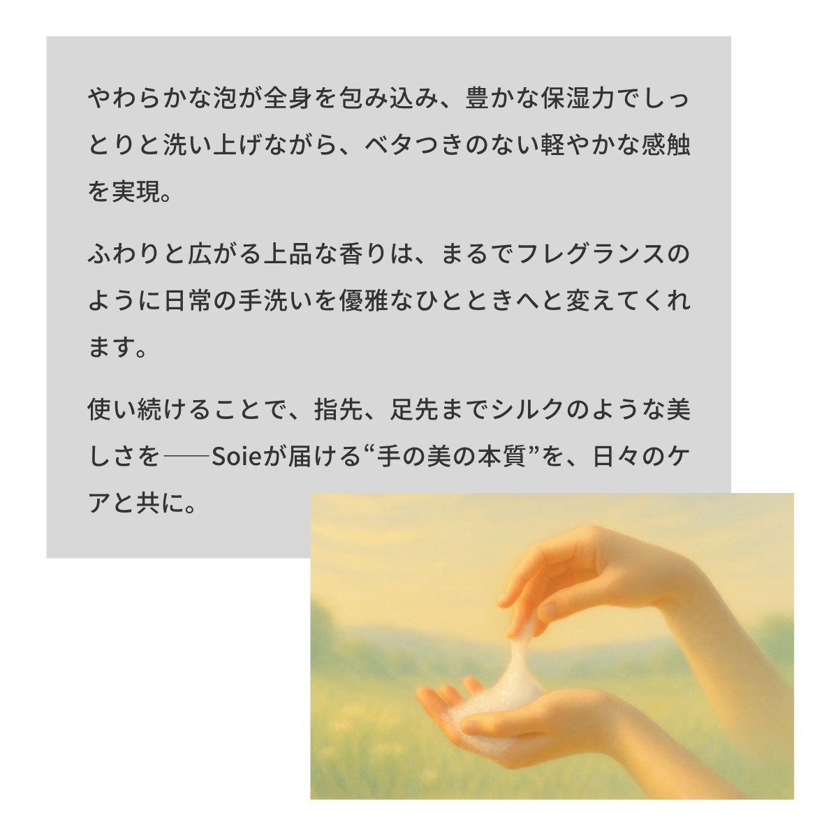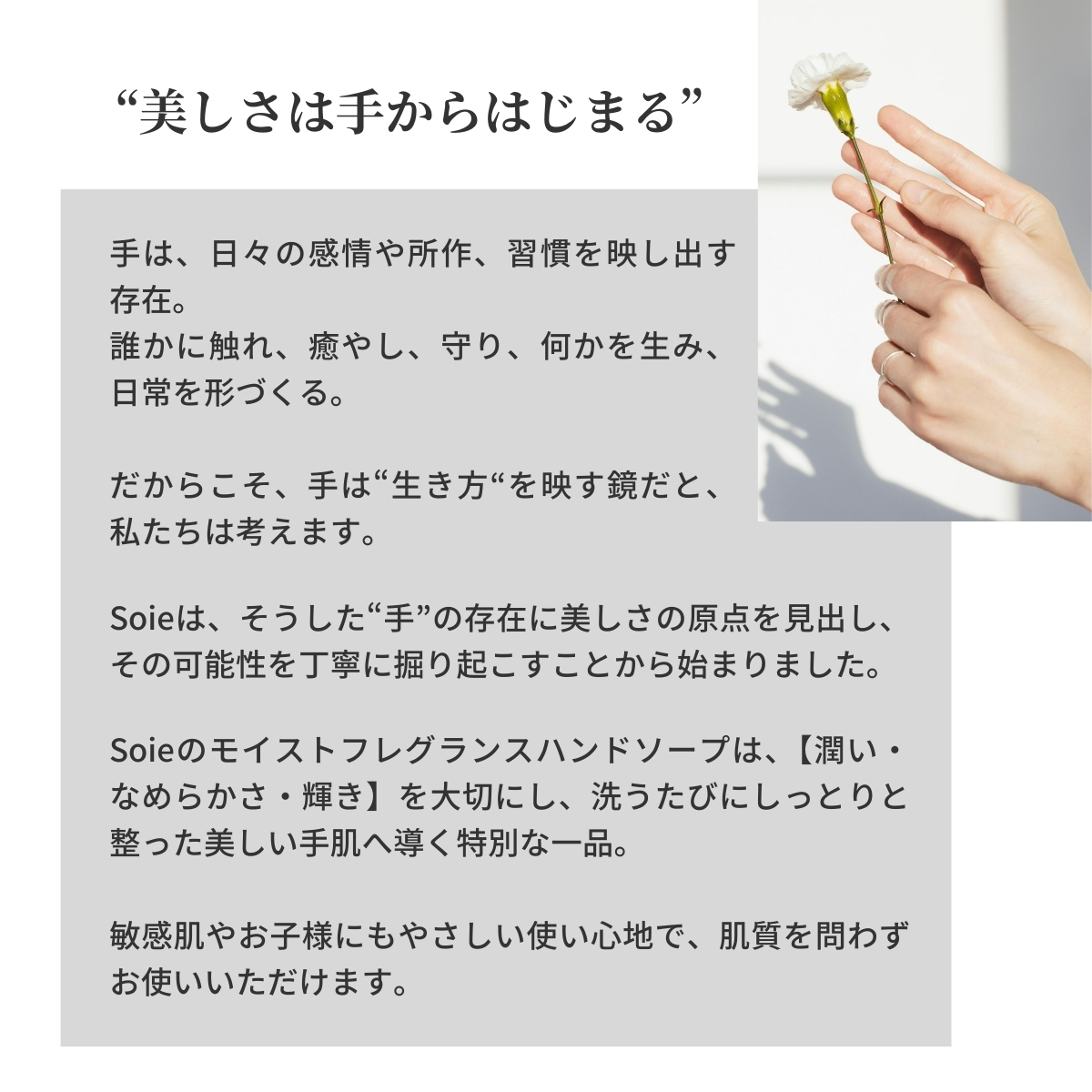 アルコールフリー・石油系成分不使用のやさしい処方で、敏感肌の方もお使いいただけます。ソワ専属調香師による奥行きのあるフレグランスが、日常の手洗いやバスタイムを特別なひとときへと変えてくれます。