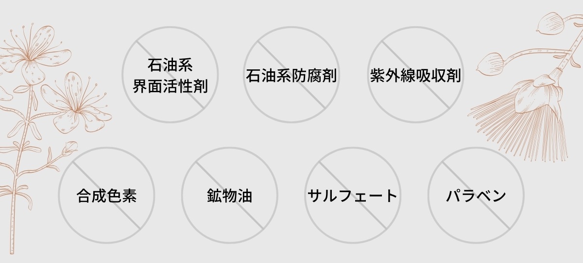 いつでもどこでも、誰とでも使いやすく、手肌に良いものだけをギュッと閉じ込めたとっておきのハンド&ボディソープにしたいとの思いから、石油系界面活性剤・石油系防腐剤・紫外線吸収剤・合成色素・鉱物油・サルフェート・パラベンなどは使用していません。